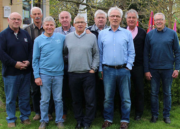 Diesmal leitete Horst Ellebracht das Treffen des Freundeskreises und begrüßte 64 Teilnehmer. Sein besonderer Gruß galt mit 84 Jahren Wilfried Wunram als ältestem Gast. Ellebracht hielt eine Rückschau auf die aktuellen Fußballgeschehnisse. Die erneute Pleite des abstiegsbedrohten Hamburger SV am vergangenen Sonntag in Augsburg beim 0-4 war Gesprächsstoff beim 124. Treffen des Freundeskreises. Und die Fachkundigen, darunter viele HSV – Fans, waren sich einig: In dieser Verfassung wird der HSV auch in den nächsten noch ausstehenden Duellen mit Mainz, Schalke und Wolfsburg nichts holen. „Es ist schon lange nicht mehr leicht, Fan des Hamburger SV zu sein,“ sagte Günther Hauschild.”Dennoch halte ich dem HSV die Treue – in guten wie in schlechten Zeiten. Noch habe ich Hoffnung auf den Klassenerhalt – und drücke dem HSV ganz kräftig die Daumen, wenn es am Sonntag, 7. Mai gegen Mainz 05 geht.“ Die Überraschung war perfekt, als sich auch ehemalige Fußballgrößen aus den glorreichen Zeiten des TUS Hessisch Oldendorf in der Vereinsgaststätte der Kolonie Am See einfanden. Erst schwelgten die TUS-Oldies in Erinnerungen, dann stellten sie sich zum Gruppenfoto (oben) auf (v.lks.): Fritz Schelenz, Günther König, Hans-Jürgen Klenner, Egbert Piotrasch, Horst Ellebracht, Hans-Jürgen Schwaneberg, Wolfgang Voigt, Dittmar Schönbeck, Günther Hauschild[/vc_column_text][/vc_column][/vc_row]