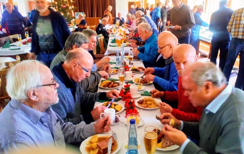 Es wurde schon mehrfach im Freundeskreis über die Fußballtaktik gesprochen: Schon vor 40 Jahren hat der damalige Bundestrainer Helmut Schön die doppelte 6, falsche 9, Ballbesitzfußball, 3er und 4er Kette sowie Computertrainer in den Blickpunkt gestellt. Den Ausspruch von Bundestrainer Jogi Löw: „Wer glaubt, als Nationalmannschaft über 20 Jahre an der Spitze zu sein, der hat den Fußball nicht verstanden!“ widerlegte Lorenz, der anführte, nicht viel von Fußball zu verstehen, mit den Präsentation der Platzierungen bei Weltmeisterschaften in 50 Jahren von 1966 bis 2014, wo die Nationalmannschaft dreimal Weltmeister, viermal Vizeweltmeister und dreimal Dritter wurde. Für die nächste EM- Quali freue er sich, dass der deutschen Nationalmannschaft eine machbare Gruppe mit Holland, Weißrussland und Estland zu gelost worden ist. Am Anschluss brachte Frank Lorenz die Versammlung mit der Kurzgeschichte: “Warum man seine Hund nicht SEX nennen sollte!“ zum Lachen und verzichtete auf die Schilderung vom Geschehen im heimischen Fußball, da der Duft der leckeren Speisen durch den Raum waberte und ab und an ein leises Magenknurren zu hören war. Mit Wünschen für ein frohes Weihnachtsfest und guten Wünschen verabschiedete Lorenz die Fußballfreunde und kündigte das nächste Treffen, am Dienstag, 5. Februar um 10 Uhr, an. Karl-Heinz Teiwes
