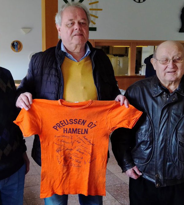 In Zeiten des Corona-Virus konnte Frank Lorenz 50 Sportfreunde zum 155. Frühstückstreffen willkommen heißen. In Abwesenheit von Wilfried Wunram war diesmal Karl Kramer, der vor ein paar Tagen seinen 86. Geburtstag feierte, der Saalälteste. Er brachte ein T-Shirt von Preußen Hameln 07 mit, auf dem sich die Spieler von 1975/76 per Unterschift verewigt haben. Fritz Oehme (auf dem Foto mit Karl Kramer) nahm es mit, damit es im Preußen 07 –  Vereinsheim einen würdigen Platz findet. Lorenz dankte Manni Kühne und „Paule“ Hauschild dafür, dass sie die Versammlung beim Februartreffen so gut unterhalten haben und Karl-Heinz Teiwes für seine Berichte auf der Preußen 07 Homepage und bei AWESA. In einem Nachruf würdigte er Otto Steffan, der kürzlich im Alter von 83 Jahren verstarb. Otto Steffan war ein langjähriges Mitglied des Freundeskreises . Er spielte  in Emmerthal und Lauenstein Fußball  und engagierte sich später auf Funktionärsebene. So wirkte er von 1957 bis 1966 in Lauenstein als Spartenleiter und von 1972 bis 1998 als 2. Vorsitzender des Kreisfußballverbandes.
