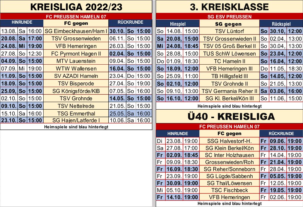 Mit einem Auswärtsspiel startet der FC Preussen am Samstag, 13. August, 16 Uhr bei der neu gebildeten SG Eimbeckhausen/Hamelspringe in die neue Saison. Danach hat 07 zwei Heimspiele in Folge. Erst gegen den TSV Großenwieden (20.8.), dann gegen den VfB Hemeringen. Die Ü40 des FC Preussen beginnt mit zwei Auswärtspartien – die Spielpläne: